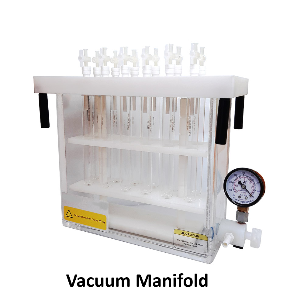 When the vacuum pump is activated, it lowers the pressure within the manifold and the connected containers. This negative pressure draws the liquid samples through filters or sorbent materials, facilitating the removal of particulates, concentration of samples, or separation of chemical compounds. The processed samples are then collected in designated containers for further analysis or use.